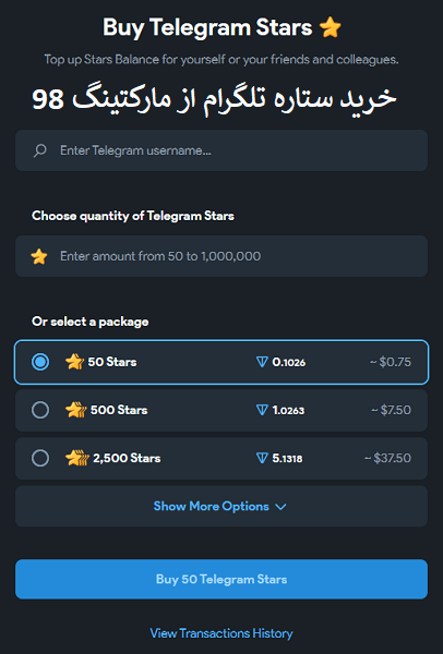 ابتدا یک وبسایت معتبر برای خرید استارز تلگرام انتخاب کنید. سایت مارکتینگ 98 از جمله گزینههای قابل اعتماد هستند.